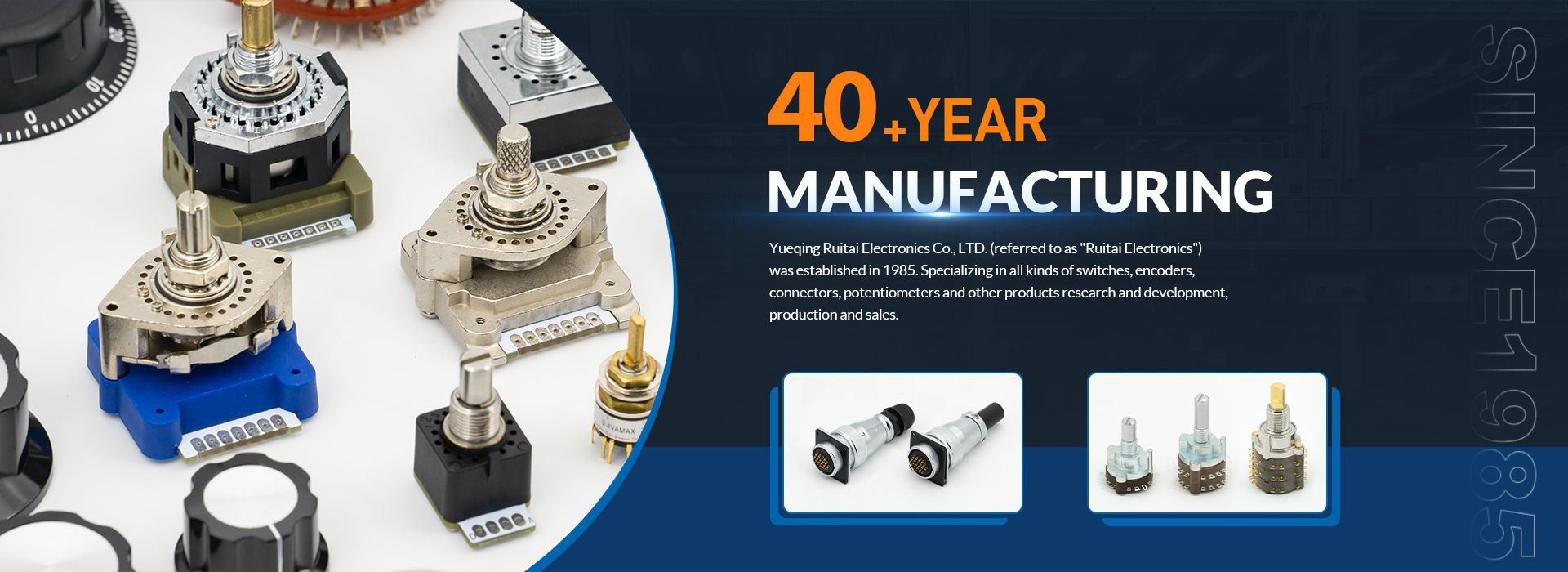 Компания Yueqing Ruitai Electronics Co., LTD. (именуемая ?Ruitai Electronics?) была основана в 1985 году. Специализируется на всех видах переключателей, энкодеров, разъемов, потенциометров и других продуктов, исследованиях и разработках, производстве и продажах. Компания объединяет науку, промышленность и торговлю, придерживаясь бизнес-философии ?реалистичных инноваций, честности и бизнеса? и реализуя бизнес-политику ?разработки инновационных продуктов, улучшения качества продукции, продуманного и комплексного обслуживания?. И постоянно комбинируйте рыночный спрос, изучайте ценные предложения клиентов, интегрируйте передовые технологии и управление внутри страны и за рубежом, а также продолжайте совершенствоваться и расширяться в развитии. В настоящее время завод занимает площадь 25 300 м2, на нем работают 113 сотрудников и 19 технических специалистов. Оснащен передовым производственным оборудованием, полной системой контроля качества, старшим отделом продаж и-послепродажного обслуживания.